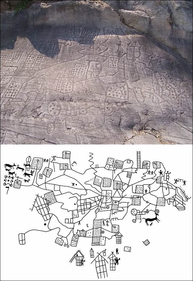 Realizzata in più fasi fra l’età del Bronzo e l’età del Ferro, mostra sovrapposizioni e aggiunte successive. È aperto il dibattito se si tratti della mappa più antica del mondo. Di certo rappresenta un paesaggio organizzato, con campi, sentieri, recinti, collegamenti e insediamenti ma ci sono anche figure umane e animali. Tuttavia, l’uso e il significato dell’opera non è chiaro nè scontato, in quanto potrebbe trattarsi di una rappresentazione simbolica magari legata a un rituale, oppure essere espressione di un potere su determinati luoghi.