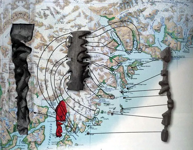Nel 1880 Gustav Holm, esploratore danese, durante una spedizione sulla costa di Ammassalik, nella Groenlandia orientale, incontrò la popolazione nativa e ricevette in dono alcuni manufatti, la cui funzione era difficile da indovinare. Le condizioni di vita estreme di qui luoghi avevano indotto gli Inuit a elaborare un sistema particolare in quanto a materiale e metodo di espressione della spazialità. La riproduzione tridimensionale di promontori ed insenature della costa ottenuta scolpendo il legno consentiva loro di orientarsi grazie al tatto, anche nel buio delle lunghe notti polari, mentre il robusto materiale legnoso non si sarebbe deteriorato in seguito a un’eventuale caduta in acqua.